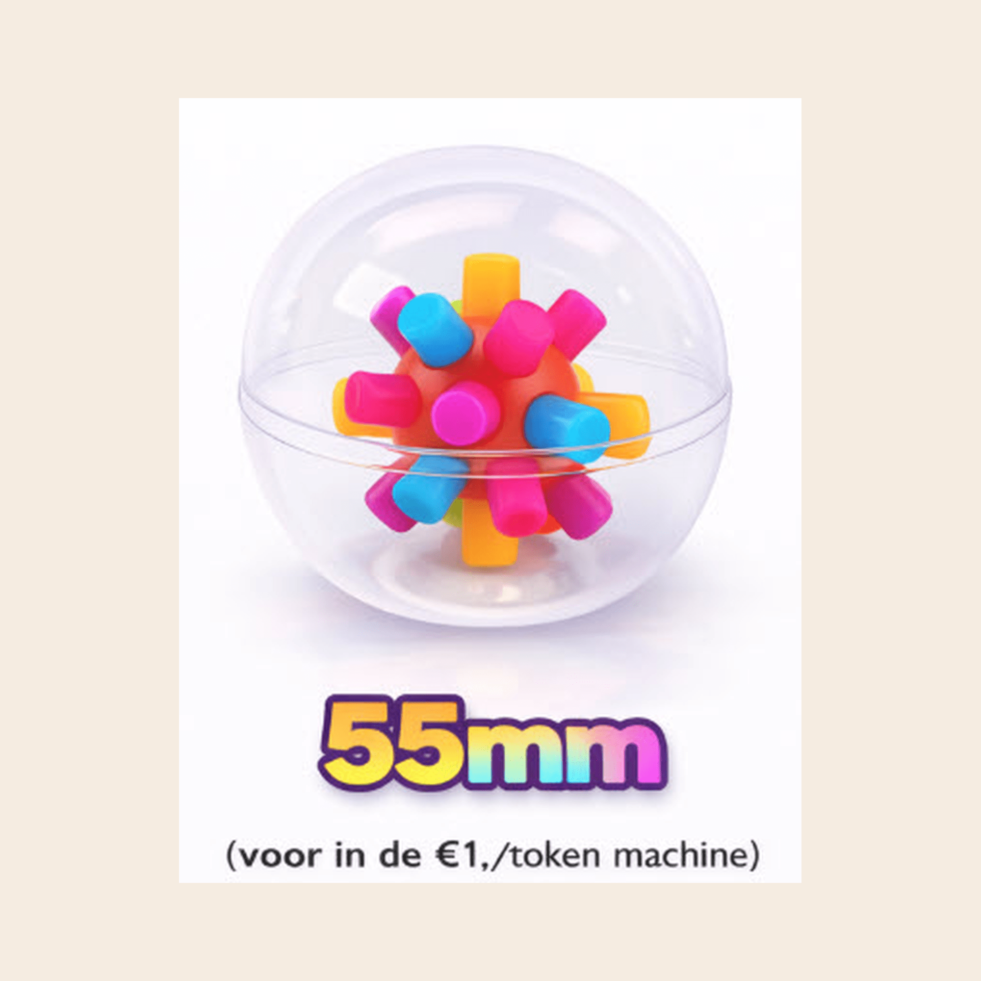 Deze 55mm capsule bevat stuiterballen met ‘firework’ effect en trekt direct de aandacht in elke vending- of actieopstelling. Zorgt voor beweging, energie en veel lol. Formaat: 55mm. deze capsule pas perfect in de vendingmachine van Bellus Toys B.V. met een €1,-/token mechanisme!