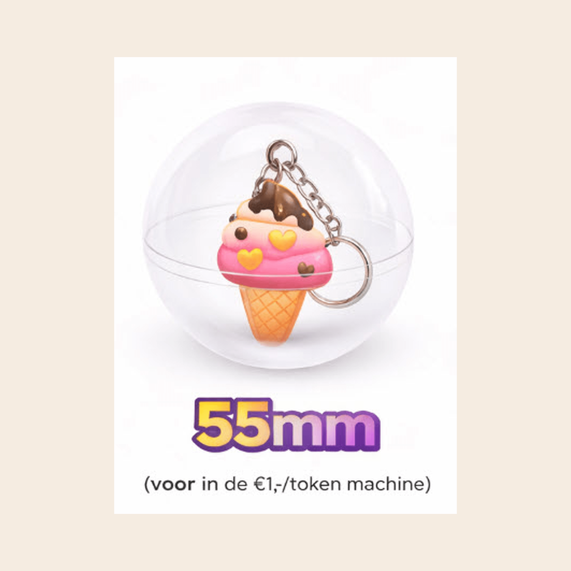 Deze 55mm capsule bevat schattige ijsjes-sleutelhangers met een zomerse uitstraling en trekt direct de aandacht in elke vending- of actieopstelling. Een vrolijk weggevertje dat meteen opvalt. Formaat: 55mm. deze capsule pas perfect in de vendingmachine van Bellus Toys B.V. met een €1,-/token mechanisme!