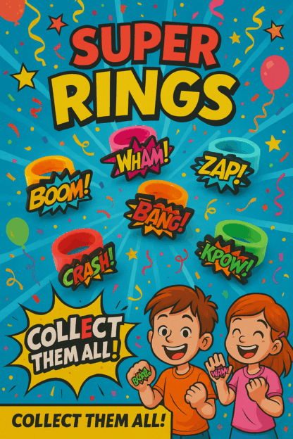Deze 68mm capsule bevat vrolijke ringen in verschillende kleuren en trekt direct de aandacht in elke vending- of actieopstelling. Leuk om te sparen en perfect als kleine verrassing. Formaat: 68mm. deze capsule pas perfect in de vendingmachine van Bellus Toys B.V. met een €2,-/token mechanisme!
