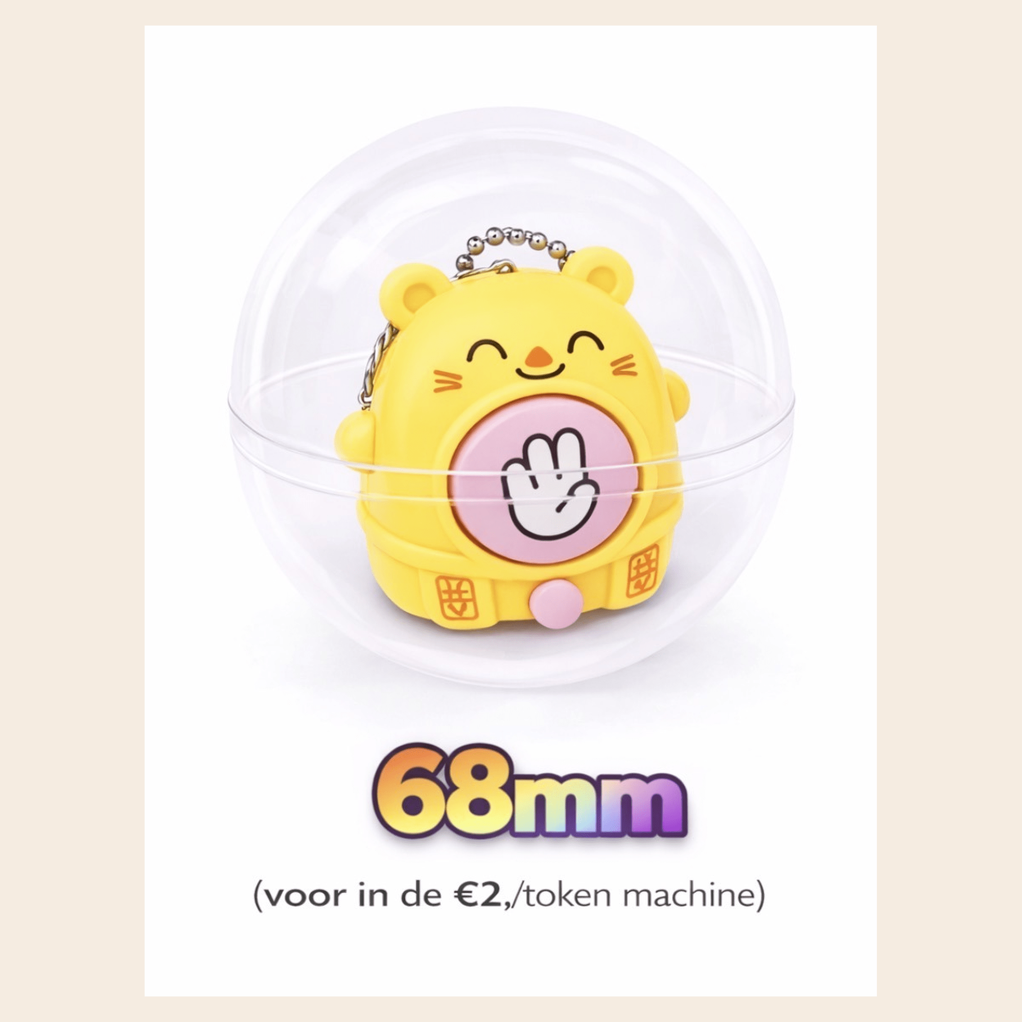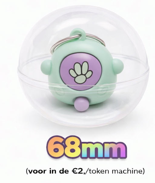Deze 68mm capsule bevat een vrolijke selectie sleutelhangers die elke capsule tot een leuke verrassing maken en zorgt direct voor plezier bij het openen. Ideaal voor sparen, weggeven of als impulsaankoop. Formaat: 68mm. deze capsule pas perfect in de vendingmachine van Bellus Toys B.V. met een €2,-/token mechanisme!